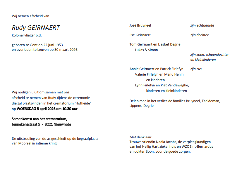 Our friend and colleague Kol Vl b.d. Rudy GEIRNAERT (°1953) (BAF 76B), passed away on monday, March 30th, 2026.